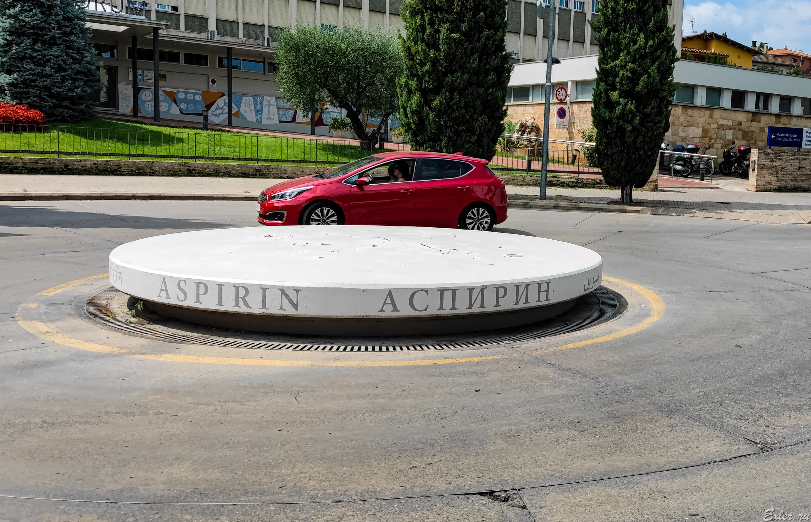 Насколько я знаю, изначально эта "таблетка" никак с Байером связана не была. В середине 90-х годов эту круглую площадь назвали площадь Аспирина и соорудили такой объект современного искусства. В разные годы устраивали всякие перфомансы. То ковром накрывали по какому-то поводу (а потом злоумышленники ковёр этот украли, и было расследование). Пару лет назад накрывали жёлтым полотном (цвет независимости Каталонии) в знак солидарности с каталанскими политзаключёнными. А этом году таблетку обновили, покрасили, сделали надписи Аспирин на 6 языках - о чём гордо сообщили в местной прессе, как и том, что вознаграждение художника составило 1000 евро 😄