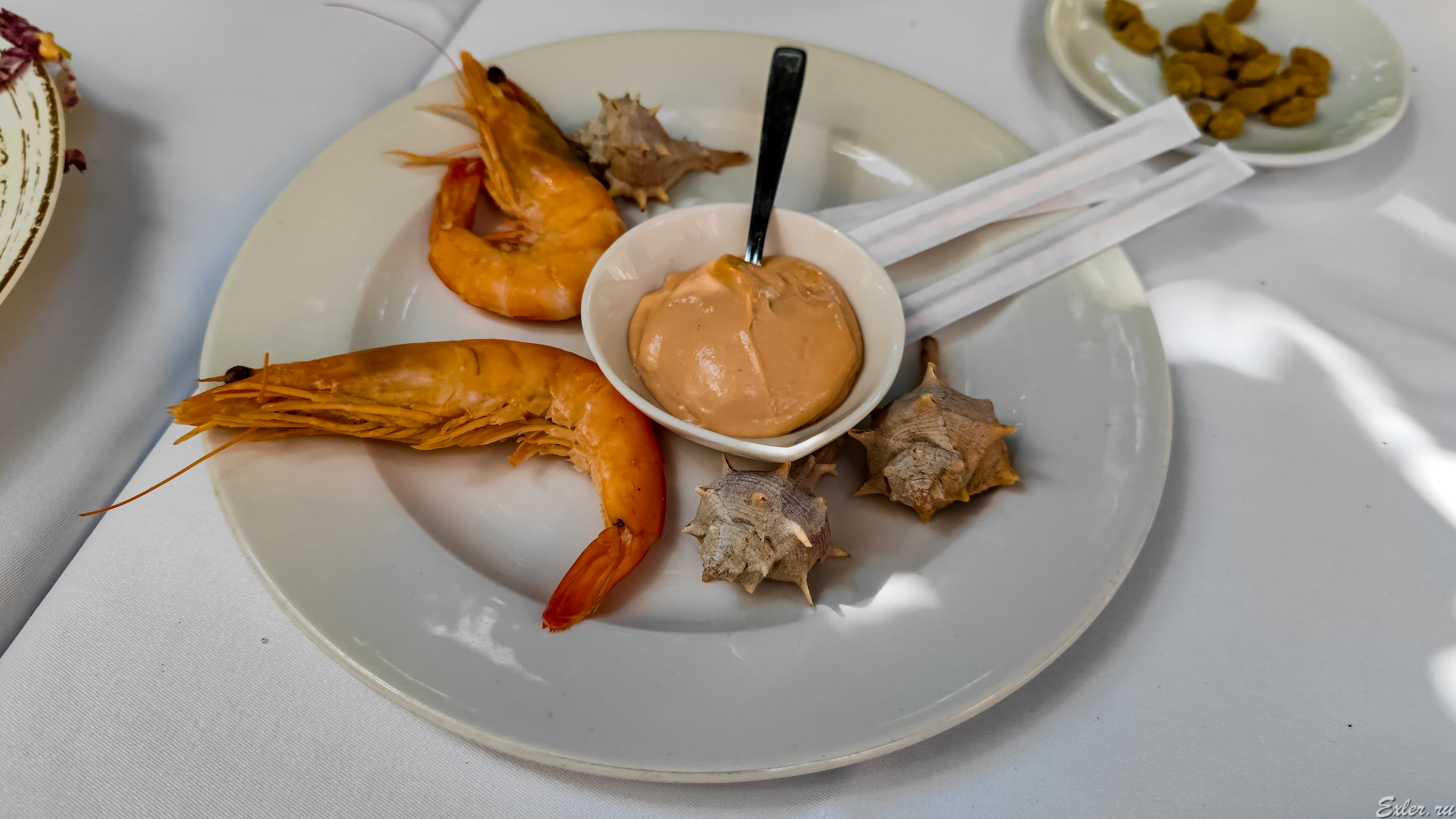 Вторая закуска называлась "Entremès de marisc" (собственно, закуска из морепродуктов) и когда нам принесли вот это, то мы совершенно офонарели. Блюдо это стоило €20,50, а на тарелке были две больших креветки и три морских улитки. И это все, спросили мы официантку? Но она нас быстро успокоила - это только для старта. Будет еще одна тарелка.