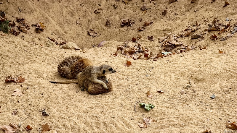 У вольера красной панды (малая панда, или кошачий медведь) обычно толпится народ, но увидеть этого зверька не очень легко: это ночное животное, а днем панда обычно отсиживается в своем домике. Во время предыдущих пяти визитов мы красную панду так и не увидели, только пару раз хвост из домика торчал. В этот раз повезло: она вышла из домика и отправилась полакомиться листьями.