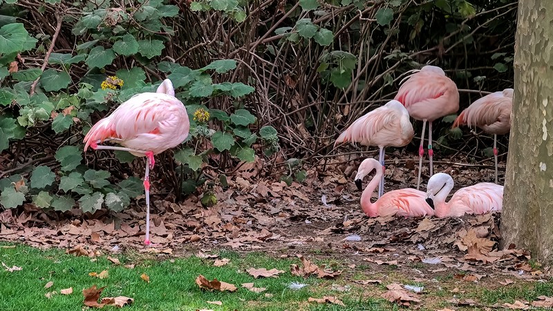 Павлин (они тут свободно разгуливают по территории и людей не боятся), розовые фламинго и другие птицы в открытом вольере.