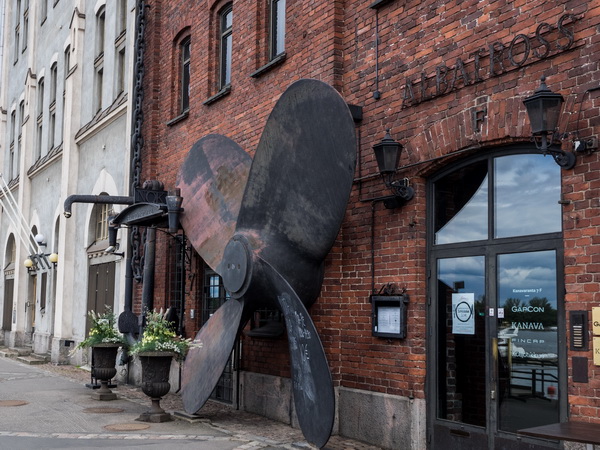Хельсинки - город морской, так что всякие морские элементы очень часто служат украшением. В данном случае огромный гребной винт корабля украшает вход в ресторан.