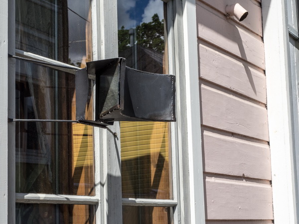 На многих окнах видны вот такие загадочные сооружения. Впрочем, я сразу догадался, что это и зачем. Там под углом расположены два зеркала, позволяющих жильцам дома наблюдать за происходящим: с помощью двух зеркал можно с легкостью видеть, что творится слева и справа по улице.
