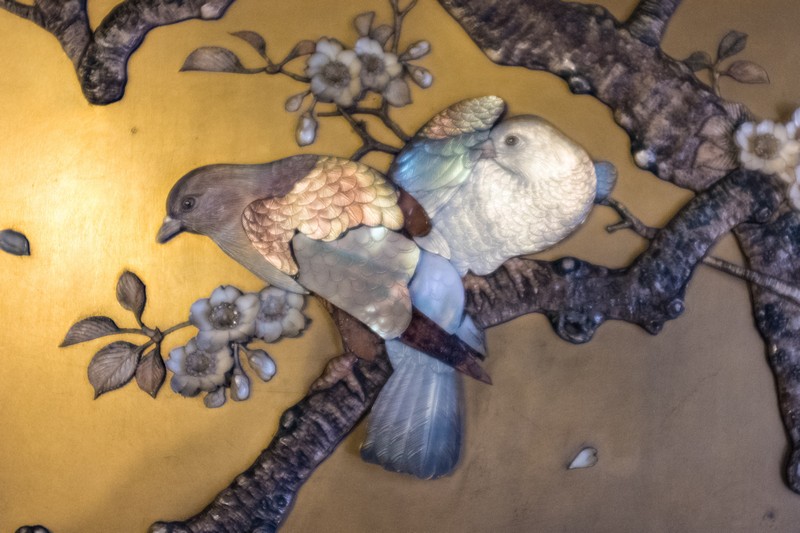 Посмотрите, какая отделка перламутром изображения птички на шкафчике.