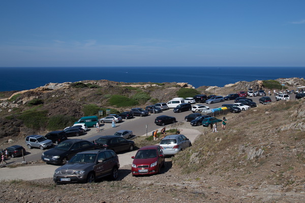 Вернулись в Кадакес. Рядом с заливом машину припарковать довольно сложно и дорого (€2 в час), зато вот здесь на пустыре есть здоровенная бесплатная парковка, где можно оставить машину. Оттуда до набережной десять минут пешком вниз с холма. Правда, потом подниматься не очень легко - холм довольно крутой.