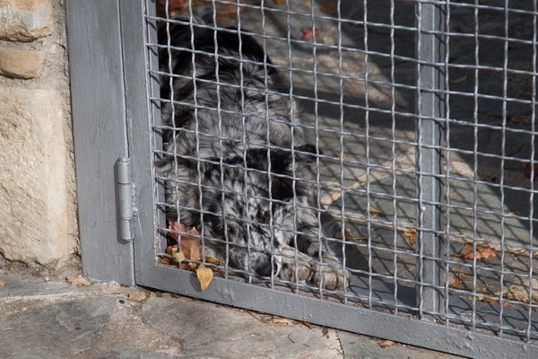 А это знаменитая собачка. Я читал в какой-то статье, что она встречает туристов и начинает их вести по всяким примечательным местам. Собачка очень умная и дружелюбная. Мы когда приехали, увидели, как собачка вела какую-то пару. Но когда уже уезжали, увидели, что собачку заперли вот за этой дверью. И она лишилась возможности сопровождать туристов. От этого собачка загрустила.