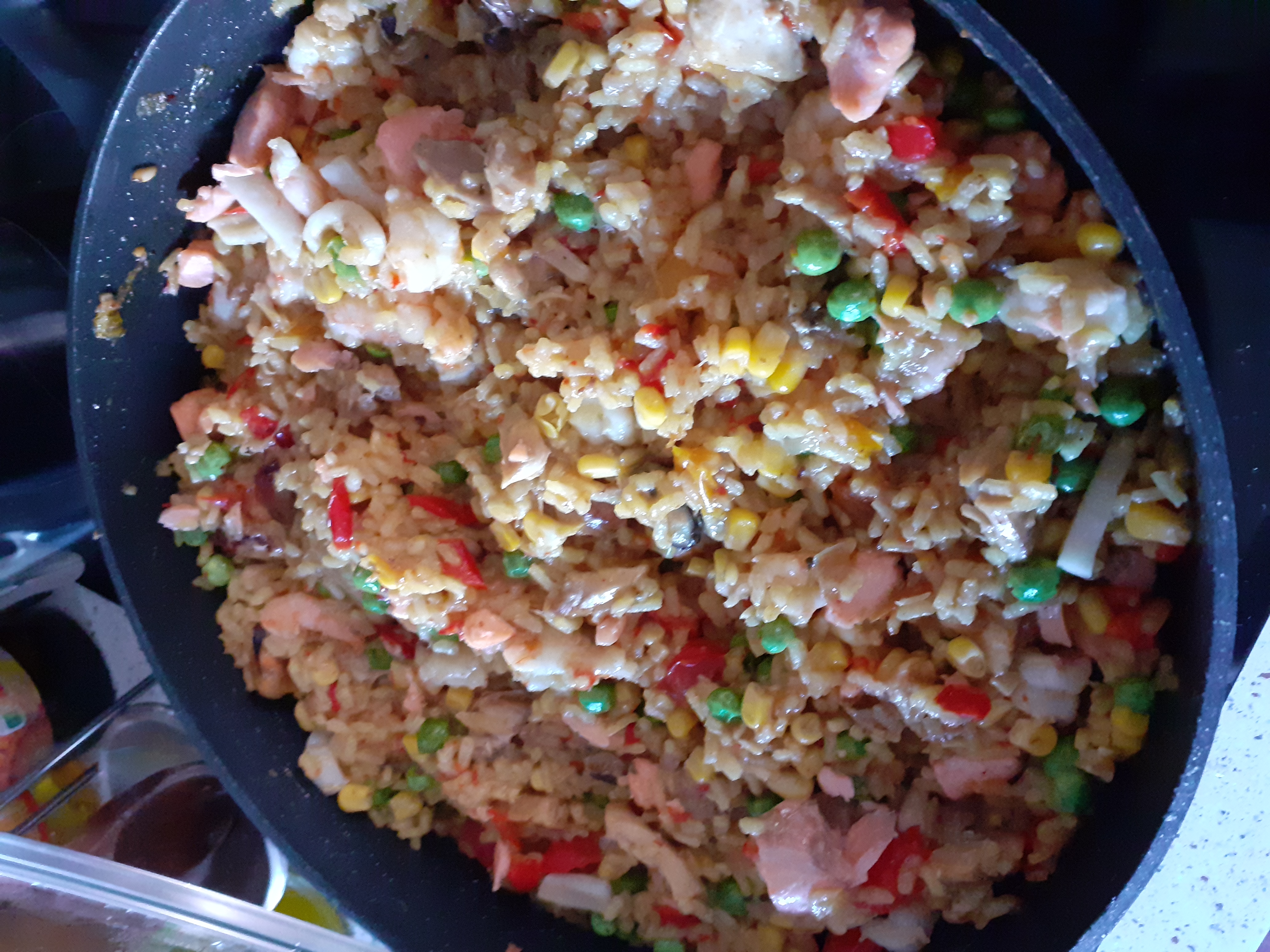 Но, да. Если мерять именно по рису, то цифры другие. И там мясо, а не морепродукты. Вообще, проблема равномерного размещения компонент на сковороде будет нелегкой.