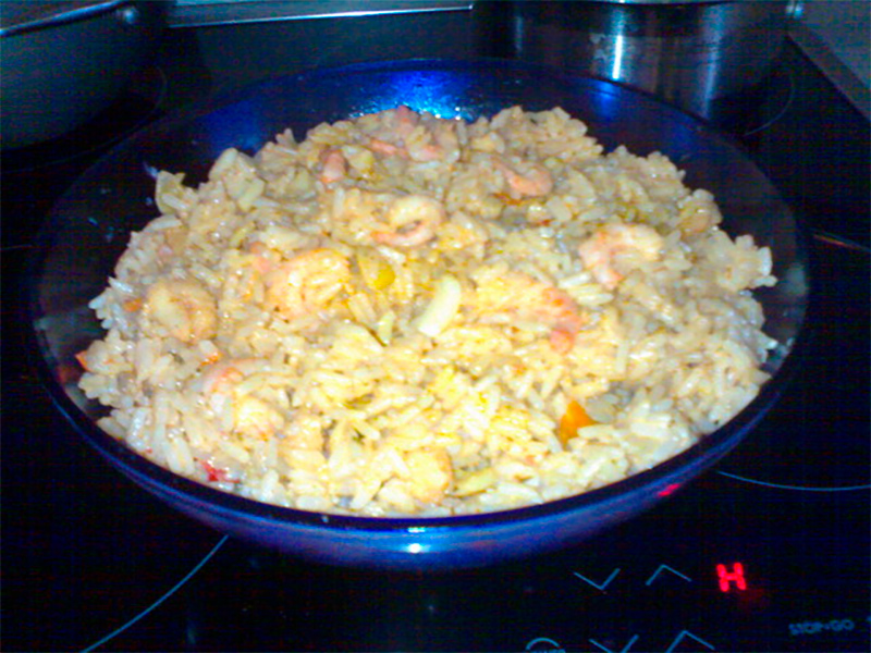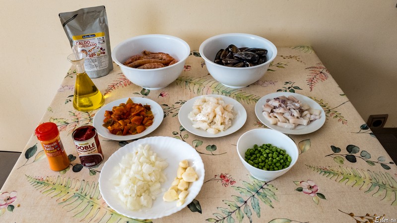 Ингредиенты: крупные аргентинские креветки (они продаются замороженными, их нужно разморозить), мидии, красный сладкий перец, порезанный небольшими кусочками, сушеная треска (ее предварительно нужно размочить), очищенные колечки кальмаров, свежезамороженный (и размороженный) горошек, резанный репчатый лук, очищенные дольки большой головки чеснока, приправа с шафраном, томат-паста, оливковое масло, концентрированный рыбный бульон, рис.