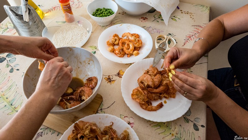 Серхио предпочитает вариант паэльи "для белоручек", поэтому креветки перед окончательной закладкой чистятся. Однако по моему мнению этого делать не стоит, я бы их положил целиком, тем более что их потом вылавливать из паэльи и чистить - это же самое удовольствие!