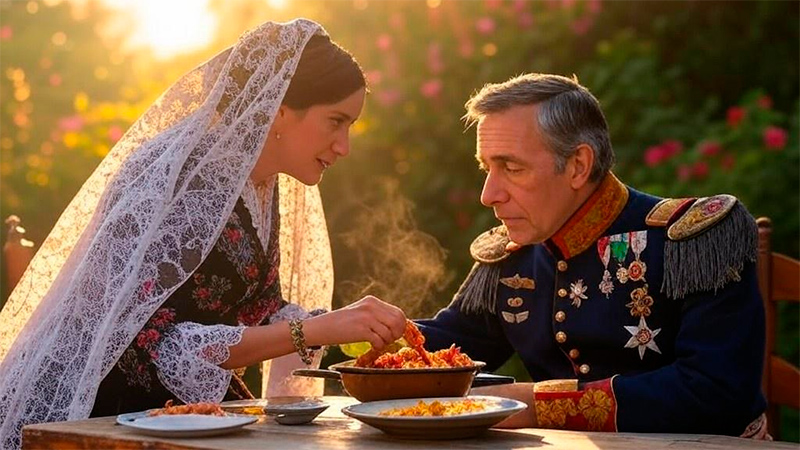 Испанка кормит французского генерала паэльей, неизвестный фотограф XIX века