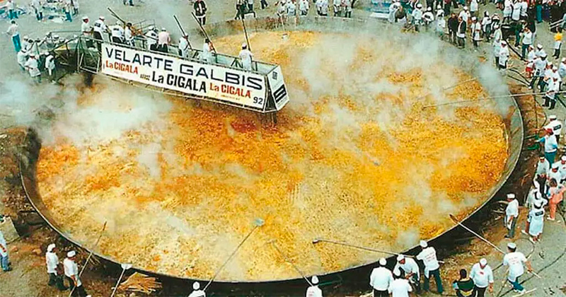 Диаметр сковороды был 21 метр, и весила эта паэлья 30 тонн. Для ее приготовления потребовалась работа более 100 поваров, а попробовало эту паэлью почти 100 тысяч человек.