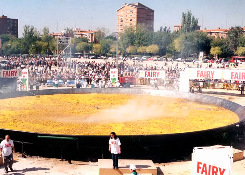 Этот рекорд был побит в 2001 году той же компанией Galbis Paellas Gigantes. Они скооперировались с производителем известнейшего моющего средства Fairy (помните ролик с деревнями Виллариба и Виллабаджо?), который спонсировал книгу рекордов Гиннеса, и в мадридском Морталесе компания сделала паэлью диаметром 21,5 м на 110 тысяч человек.