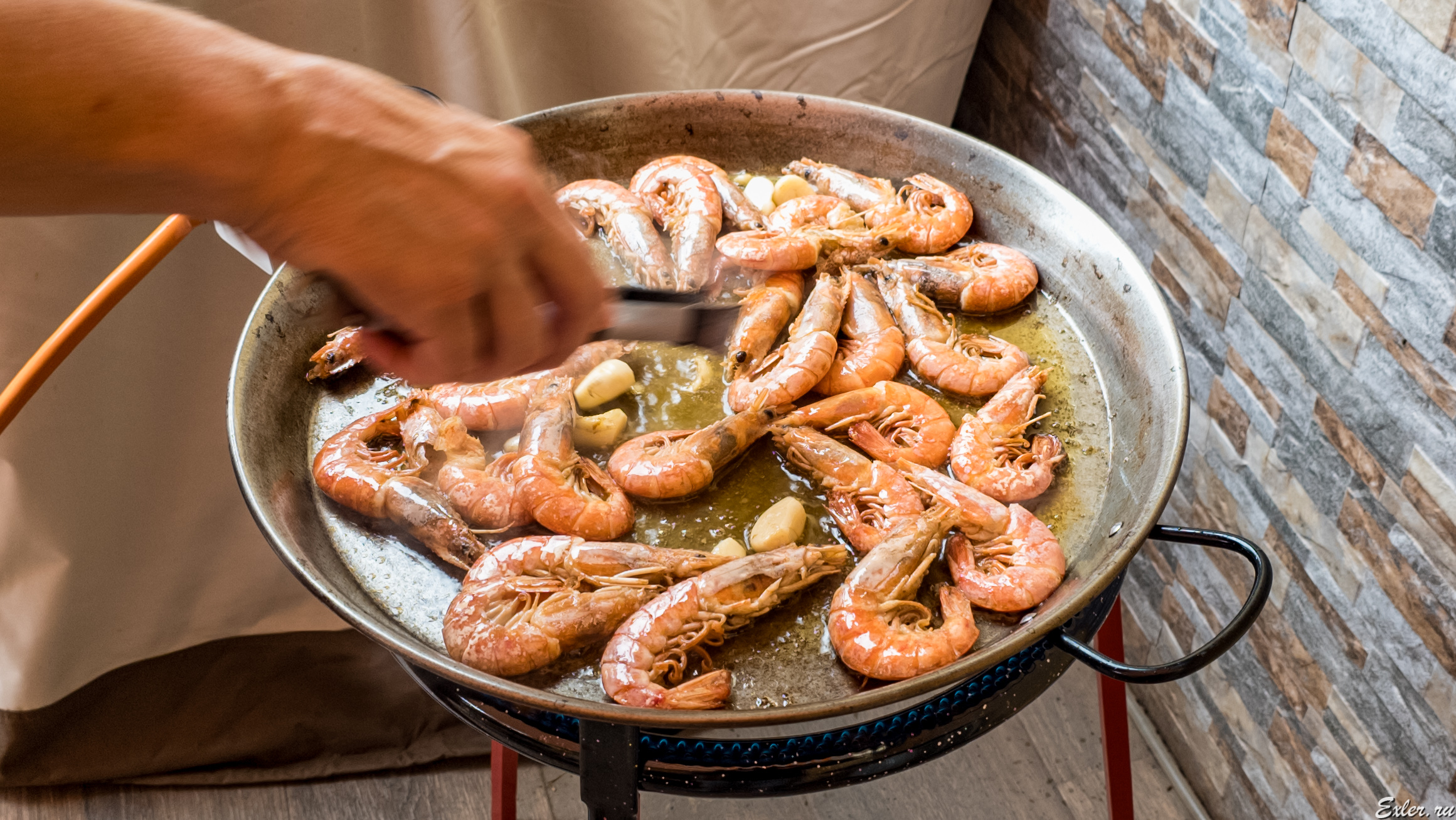 В паэльеру наливается оливковое масло, в нем обжариваются слегка раздавленные дольки чеснока, как только чеснок станет золотистым, в масле обжариваются креветки буквально пять минут.