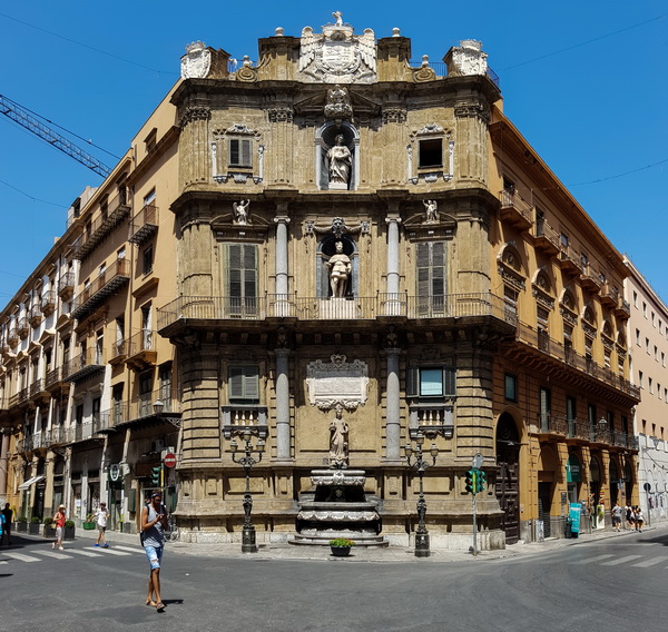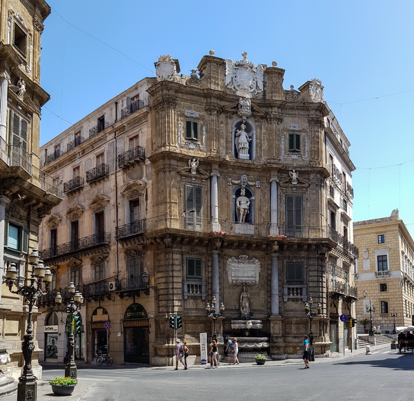 Недалеко от Театра Массимо находится совершенно знаковое место Палермо - площадь XVII века Кватро Канти, где пересекаются две главных улицы Палермо: via Maqueda и corso Vittorio Emanuele. Каждый из четырех углов площади - поразительной красоты и пышности торец здания.