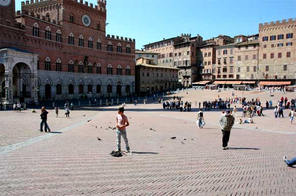 Крайне интересно административное деление Сиены. Город стоит на трех холмах, как бы спускаясь с них к центральной площади - Пьяцца Дель-Кампо. Все дороги города ведут к Дель-Кампо, которая имеет полукруглую форму и представляет собой как бы створку раковины.