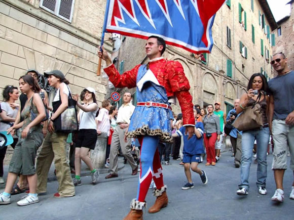 Дурдом? Дурдом, конечно. Но в Сиене именно так и происходит! Принадлежность к контраде (району) накладывает отпечаток на всю жизнь. У каждой контрады свой герб, свое животное-покровитель (или талисман), свой флаг, свои кричалки, костюмы и так далее.