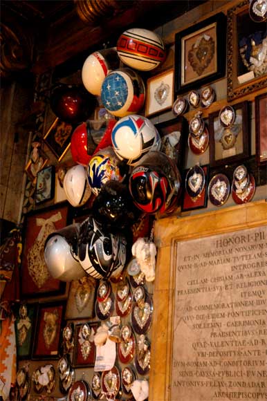 Здесь вывешиваются шлемы победителей каких-то спортивных соревнований и полученные награды. Смотрится это весьма эффектно, но несколько неожиданно.