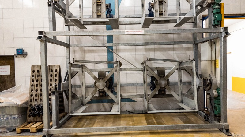 Слева стоит деревянный пюпитр для ремюажа, а справа - здоровенное механическое устройство для ремюажа: вручную ремюаж уже мало кто делает, это слишком утомительный процесс. Куда проще для этого использовать механические установки.
