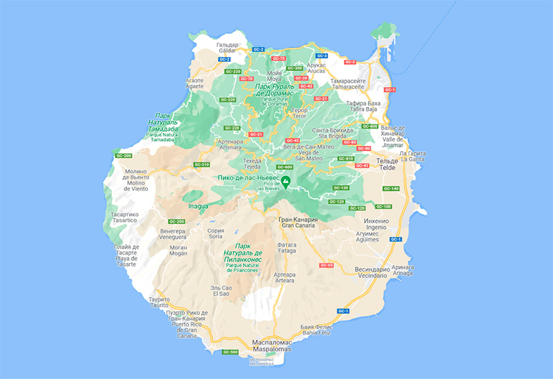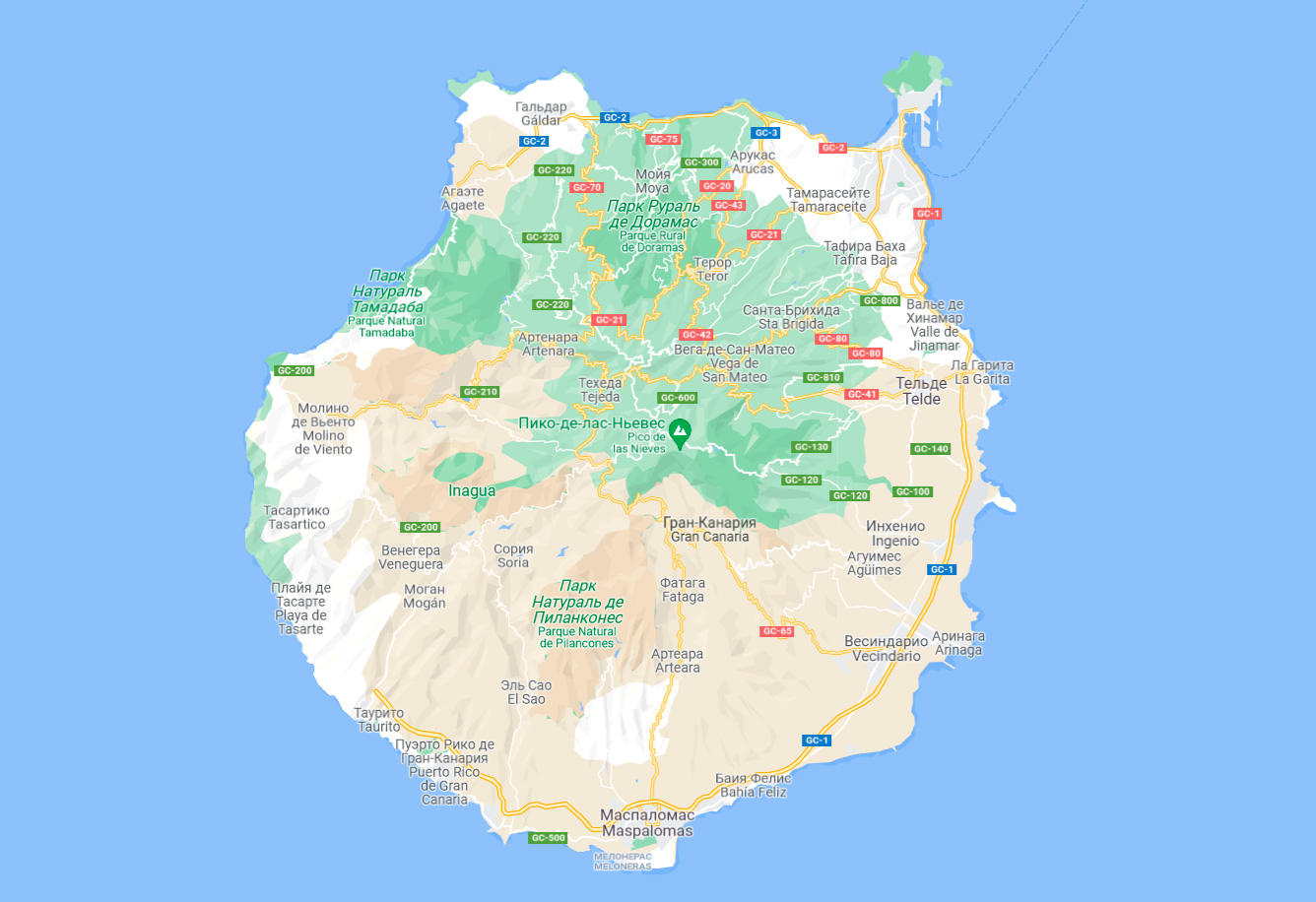 Остров Гран-Канария находится в 65 километрах от Тенерифе. Его площадь - 1560 км², наивысшая точка - 1956 м над уровнем моря. Протяженность от севера до юга - 45 километров. Верхняя часть острова - гористая и лесистая, южная часть острова - более равнинная.
