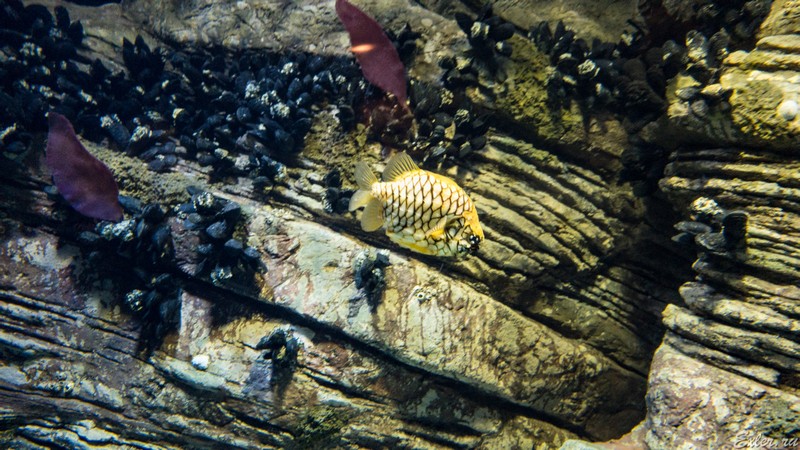 Ниже - небольшой закуток, куда протиснулся страшно недовольный чем-то австралийский группер (каменный окунь).