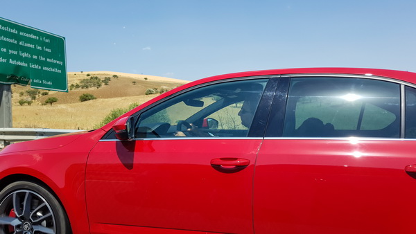 Еще один длинный перегон в Таормину, во время которого я потестировал очень продвинутую систему круиз-контроля и всяких средств безопасности: следование за ведущим, удерживание в полосе, предупреждение о выходе из полосы, датчик слепой зоны (просто-таки необходимая штука, я себе эту опцию, разумеется, брал, она меня уже раза два спасла от возможных столкновений при нахождении боковых машин в мертвой зоне).