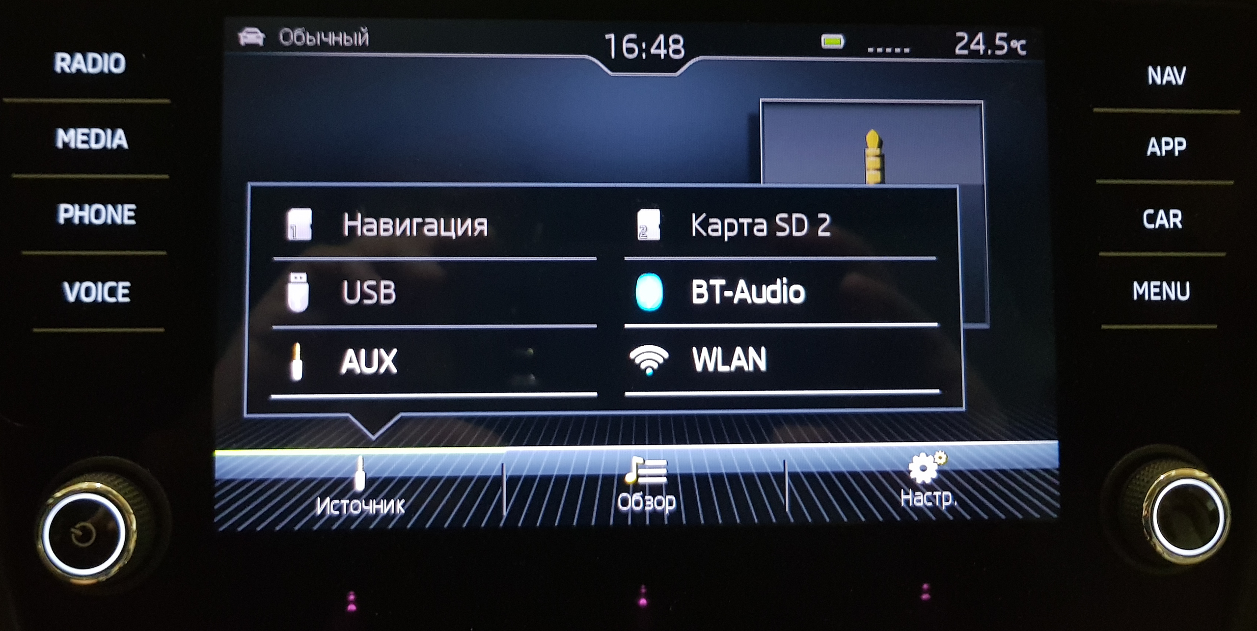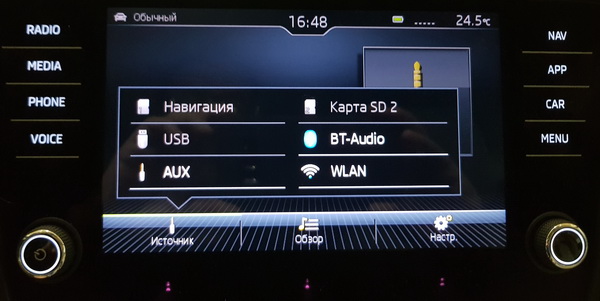 Подключенные медиа: навигация (специальный DVD-диск, который вставляется в установку, находящуюся в отделении для перчаток), порт USB (к нему можно подключать смартфон и выводить изображение со смартфона на дисплей машины), AUX, карта SD, Bluetooth и WLAN.