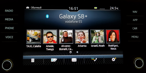 Подключенный по BT смартфон, с которого загружаются контакты. Есть поиск контактов, можно задать избранные контакты.