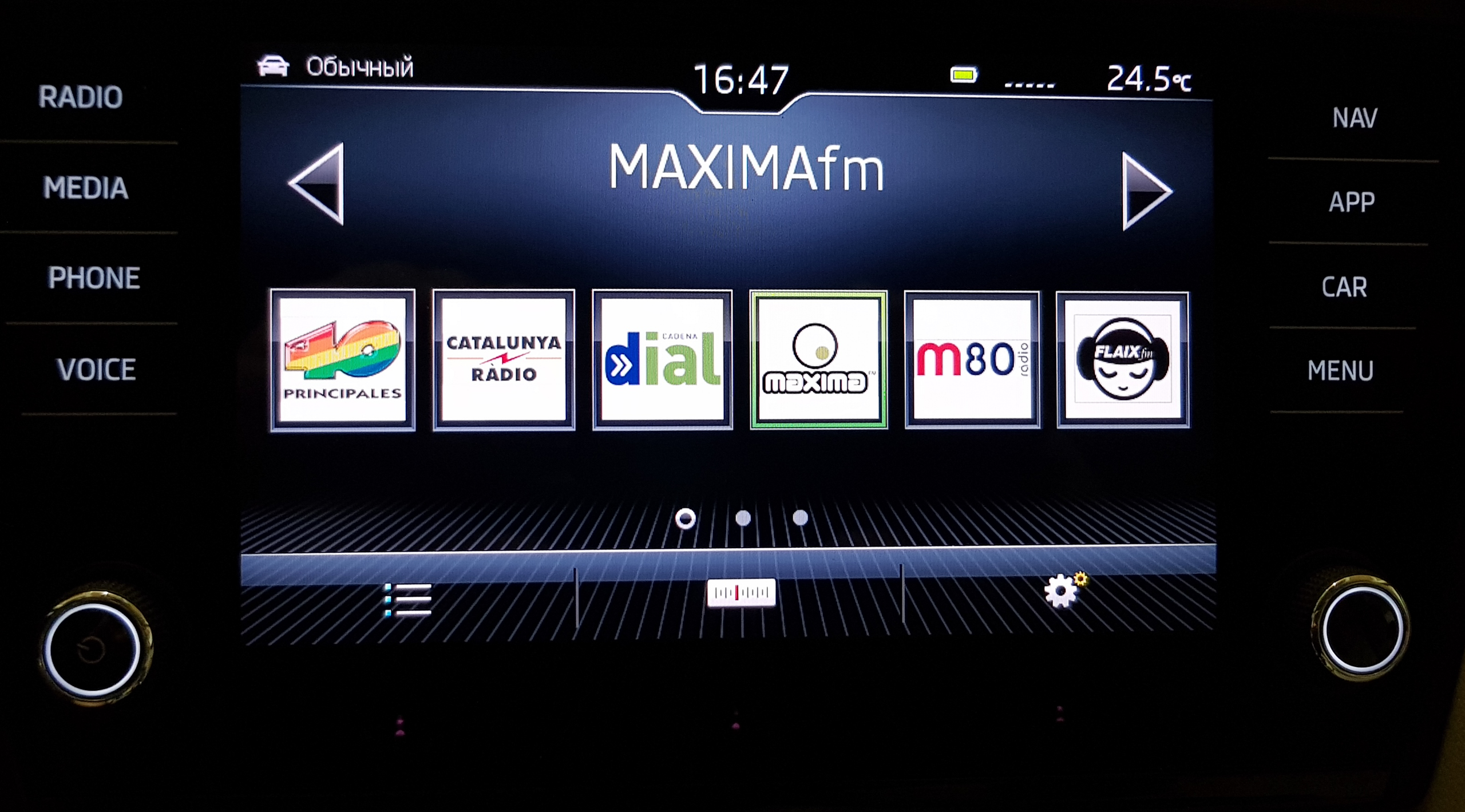 Радио. Три закладки с пиктограммами станций, различные виды настроек.