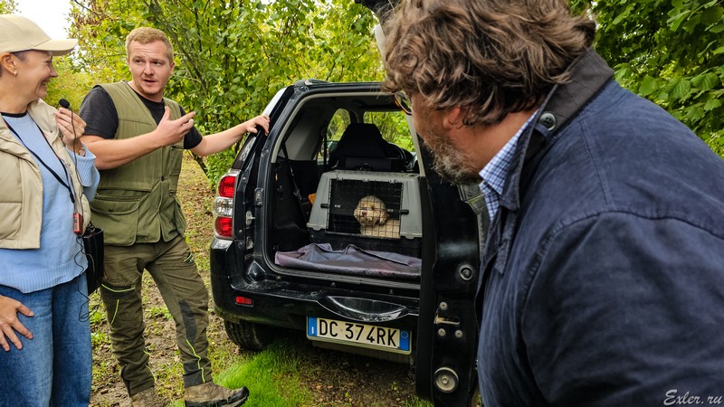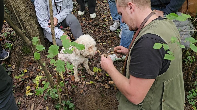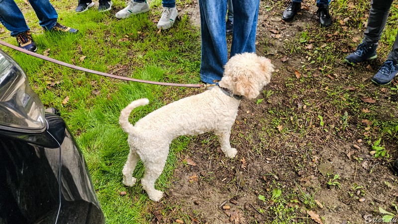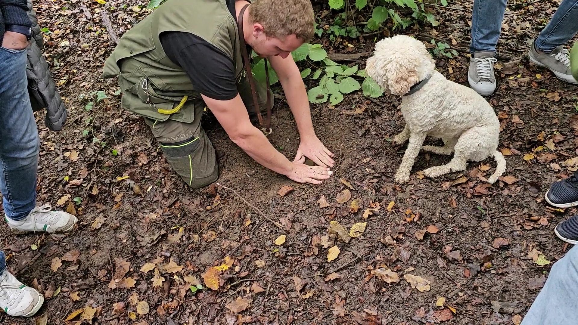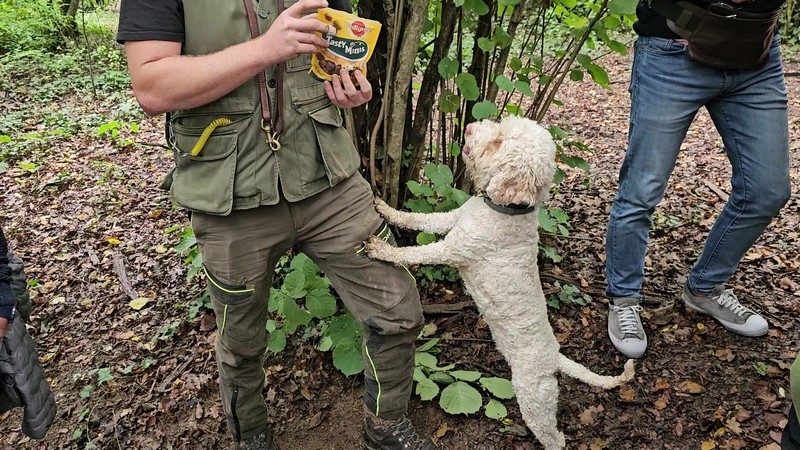 Охотник Даниэле показывает свое сокровище - собачку Бьянку, которая для него ищет трюфели. Даниэле рассказал, что для тренировки собачке, когда она еще пьет материнское молоко, соски матери обмазывают мелко измельченным белым трюфелем - чтобы у нее этот запах ассоциировался с чем-то родным, вкусным и безопасным.