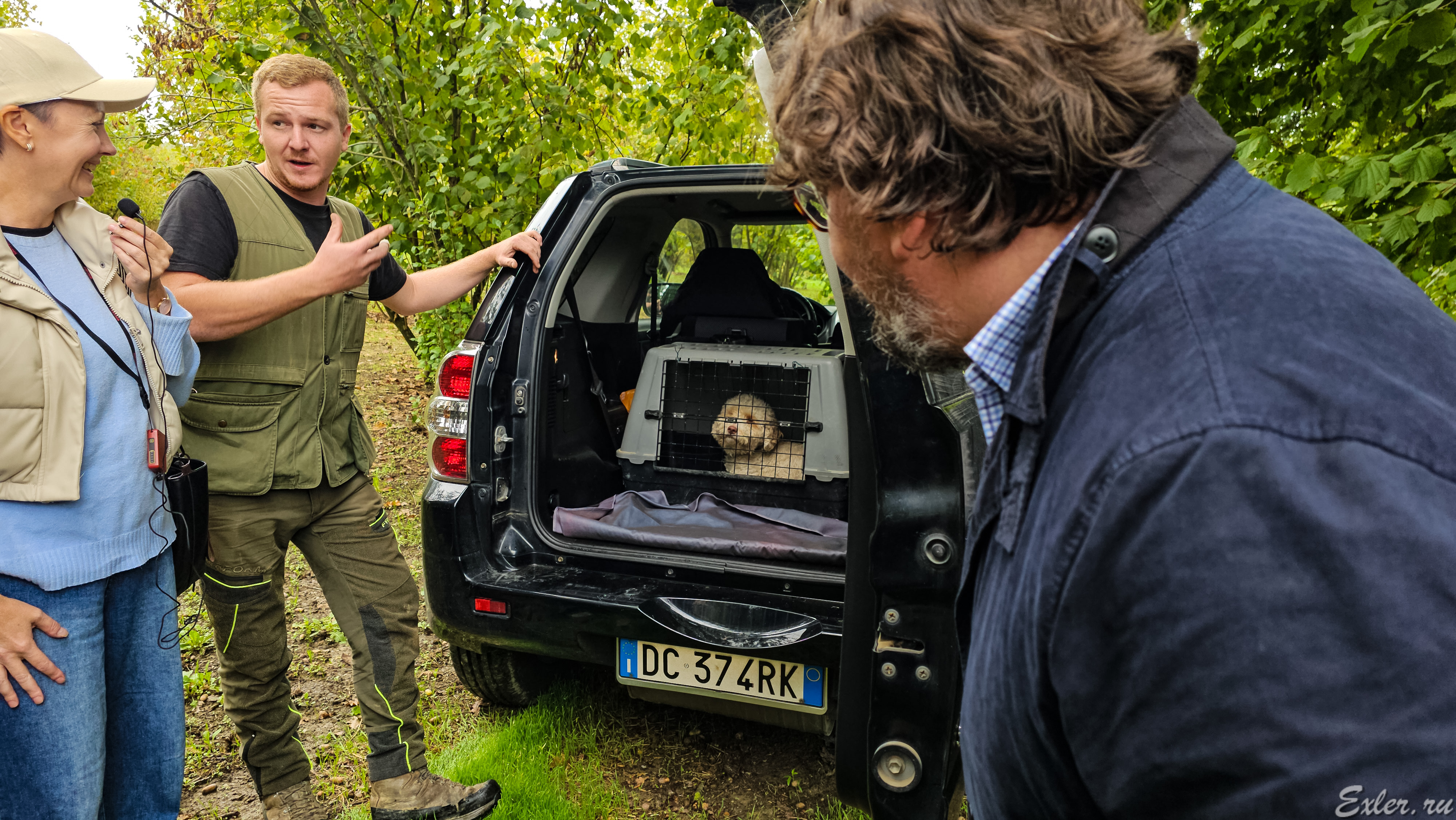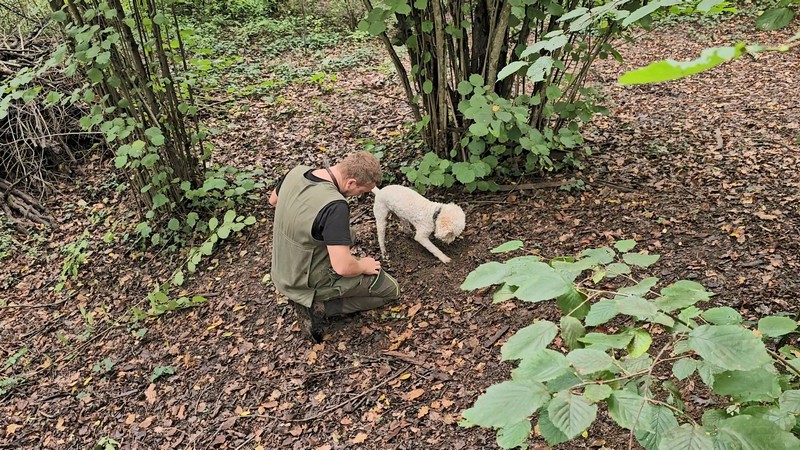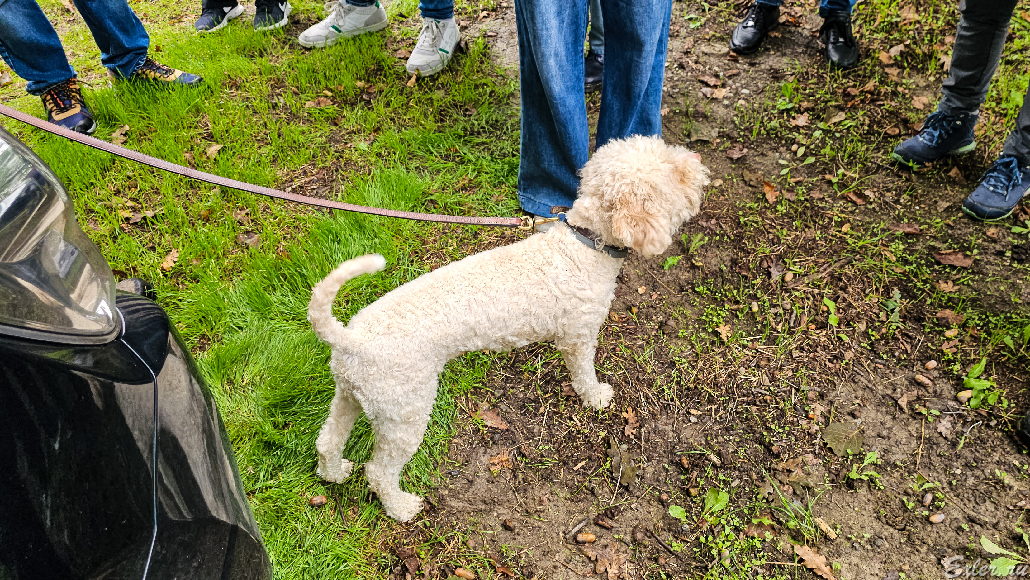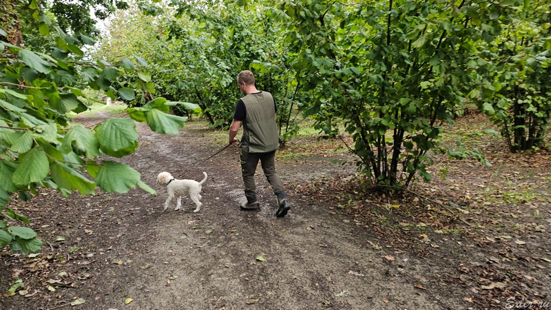 Пришли в лес. Даниэле спустил Бьянку с поводка, та стала бегать по лесу и искать трюфели. Как только она что-то нашла, то начала в этом месте рыть землю.
