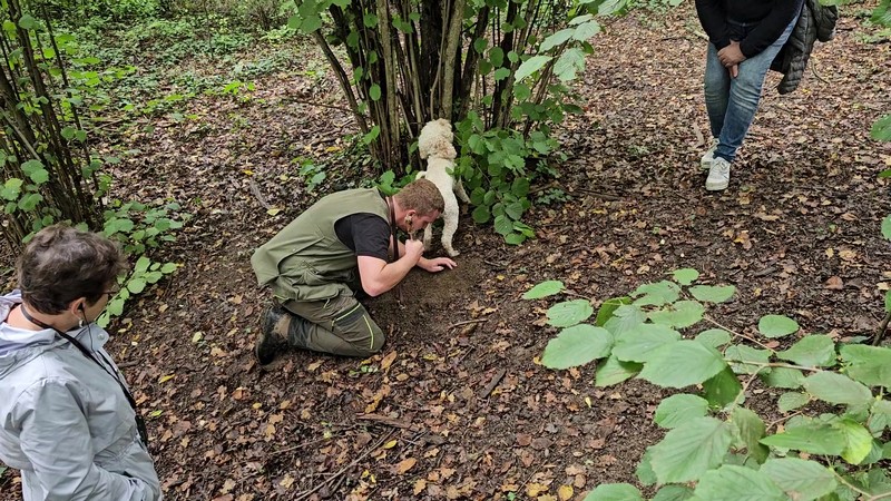 Нам в Пьемонте показали, как производится охота на трюфели, и мы получили возможность понаблюдать, как это происходит в обычном лесу, а не на какой-нибудь специально высаженной трюфельной роще (бывают и такие: покупаются деревья с трюфельной грибницей - дубы или орешник, - высаживаются ровными рядами, и там потом добывают трюфели).