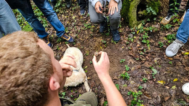 Теперь давайте поговорим о том, как трюфели добывают. Вопреки распространенной легенде, на трюфели не охотятся со свиньями. Свинья не поддается дрессировке, и шататься по лесу вслед за свиньей, ждать, когда она обнаружит трюфель и потом пытаться не дать ей этот трюфель сожрать (свинья ведь не Никита Сергеевич, ей трюфель нравится) - занятие очень неблагодарное. Поэтому на трюфели охотятся со специально выдрессированной собакой. Обучать собаку начинают с самого раннего возраста, и дрессировка продолжается два-три года.