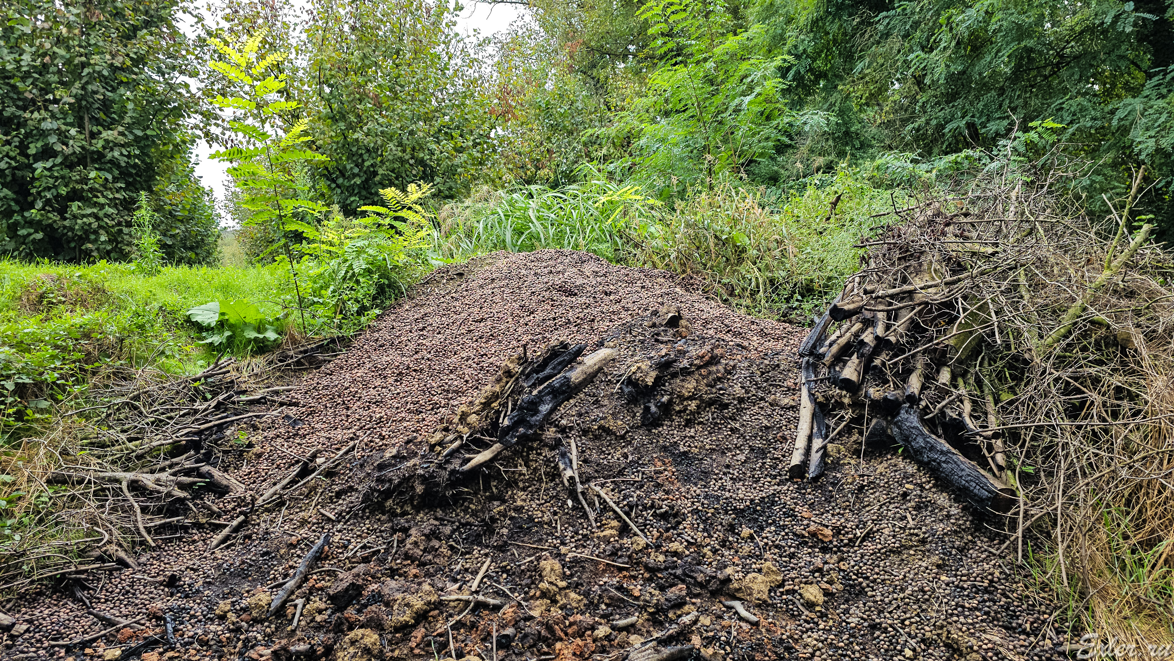По пути встретили вот такую гору фундука. Даниэле рассказал, что фундук добывают машинным способом, и машина сама отсортировывает пустые скорлупки и бракованные орехи. Их после этого собирают в такие кучи и сжигают.