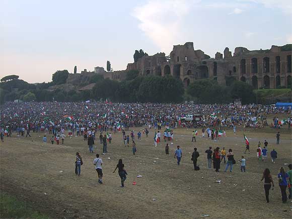 Впрочем, периодически здесь все-таки собираются толпы народу: то на рок-концерты, то для  совместного просмотра каких-нибудь важных спортивных состязаний (передачи транслируются на огромных экранах). Вот, например, фотография трансляции с чемпионата мира по футболу 2006 года - Италия играет с Францией (взята отсюда):