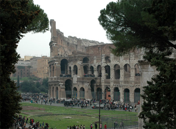 Впрочем, когда приближаешься к Колизею со стороны Большого Цирка, в первую очередь в глаза бросается арка Константина, стоящая совсем рядом с Колизеем. С холма Палатина ее загораживают деревья, но выглядит сооружение все равно очень внушительно: