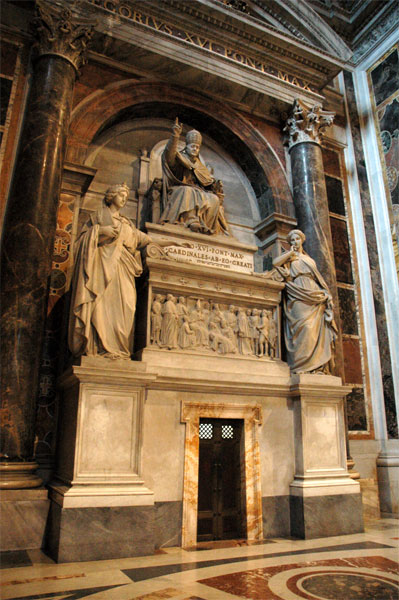 Это самое крупное сооружение в Ватикане и самая большая христианская церковь в мире. Строить ее начали в XV веке при Юлии II, который приказал на месте находящейся в аварийном состоянии древней базилики построить огромный собор, который был бы больше любых языческих храмов и христианских церквей. С 1506 по 1546 год на проекте сменилось аж несколько главных архитекторов, каждый из которых продвигал свою форму сооружения: Браманте строил собор в форме греческого креста, Рафаэль решил переделать его в сторону латинского креста, Перуцци предпочитал центрическую форму, Сангалло склонялся к базиликальной форме. Наконец, в 1546 году руководство работами передали Микеланджело, который вернулся к идее центральнокупольного сооружения с многоколонным портиком с восточной стороны. Однако в начале XVII века архитектор Мадерно пристроил к центральной части базилику с фасадом, в результате чего центральная часть стала нормально восприниматься только издали.