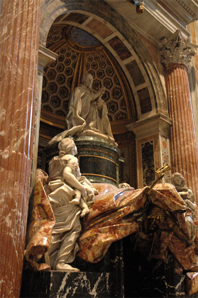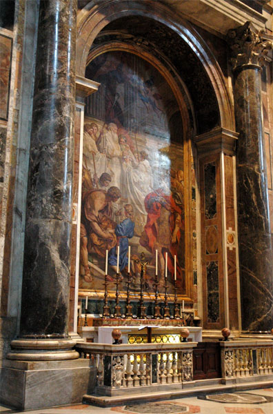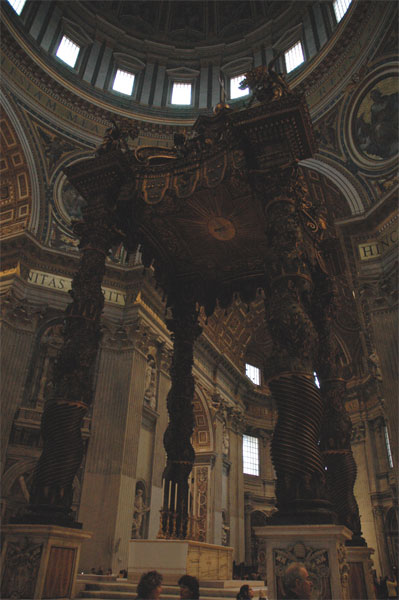 На фотографии балдахин Бернини выглядит серенько (было же темно, да и снять его непросто), а в действительности он очень внушительный. Обвитые виноградными листьями колонны, кстати, происходят из Греции.