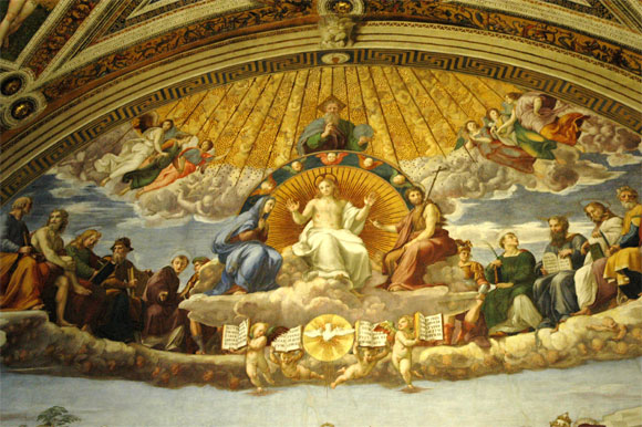 Действующие лица сверху вниз: Бог Отец, под ним - Христос с Богоматерью и Иоанном Крестителем, ниже - голубь, символ Святого Духа, ну и восседающие на облаках апостолы. Вся композиция проникнута спокойствием и умиротворением. Книги, которые держат ангелы, несут чисто декоративную функцию - буквы на них написаны примерно 48-м кеглем, так что читать их невозможно. Что хотел сказать художник этой картиной? Ну уж точно не "Чтение - лучшее учение". Некоторые пропапски настроенные искусствоведы утверждают, что данная фреска прославляет триумф церкви, хотя я считаю, что Рафаэль все-таки прославлял не столько церковь, сколько ее высшее начальство.