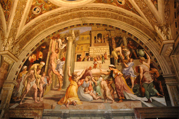 В залах верхнего этажа Папского дворца - в основном Рафаэль. Эти залы также называют на итальянский манер - станцы Рафаэля. Папа Юлий II выбрал эти помещения для своей резиденции, не желая жить в апартаментах Александра VI (Борджиа, Борджиа, ненавистные Борджиа), и поручил их расписать Рафаэлю, которому на тот момент было всего двадцать пять лет. Фрески хорошо сохранились, а каждая композиция занимает стену целиком.