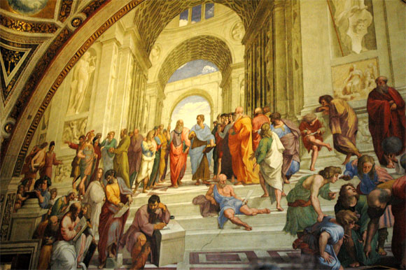 Нечто вроде выпускной фотографии. В центре композиции - фигуры Аристотеля и Платона. У Платона почему-то физиономия Леонардо да Винчи, но сам Рафаэль уверял, что это Платон, а он просто отвлекся в процессе создания данного шедевра. Платон воздевает руку к небу - в знак того, что нужно лучше думать головой, а не заниматься черт знает чем. Аристотель указывает рукой вниз — в знак того, что все там будем, поэтому давайте веселиться, так как жизнь коротка. Диоген с ним согласен, поэтому в непотребном виде лежит на лестнице. Снизу находится Пифагор в окружении учеников, ни один из которых из уважения к учителю не носит штаны. Справа от него сидит Гераклит, который похож на Микеланджело. Все лица на фреске проникнуты покоем и умиротворением. Кроме лица Диогена, которое проникнуто алкогольной интоксикацией.