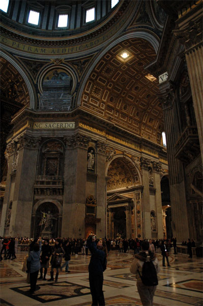 А вот собор Святого Петра изнутри - о, это действительно обязательно нужно видеть! Тут никакие фотографии даже рядом не передадут красоты, величия и масштабов этого огромнейшего сооружения. Старина Марк Твен в своей повести "Простаки за границей, или Путь новых паломников" рассказывал, что когда-то Наполеон здесь потерял десятитысячное войско. Дескать, полководец назначил встречу войску у одной колонны, а они ждали его совсем у другой - в результате они еле-еле нашли друг друга.