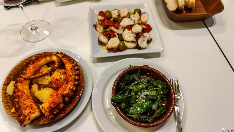 Меню там состоит всего из десяти блюд. Я взял маринованного осьминога, осьминога на гриле (точнее, на планче, на жарочной поверхности) и мои любимые маленькие зеленые перцы - они жарятся в масле и потом посыпаются крупной солью.