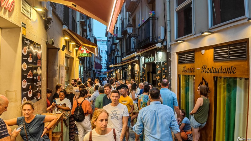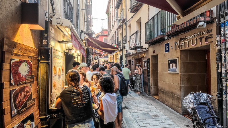 Вообще самая веселуха - это взять вина с пинчос, выйти на улицу и там этим всем наслаждаться, стоя за столиками, поставленными снаружи. Часто таковыми столиками служат бочки, поставленные вертикально.