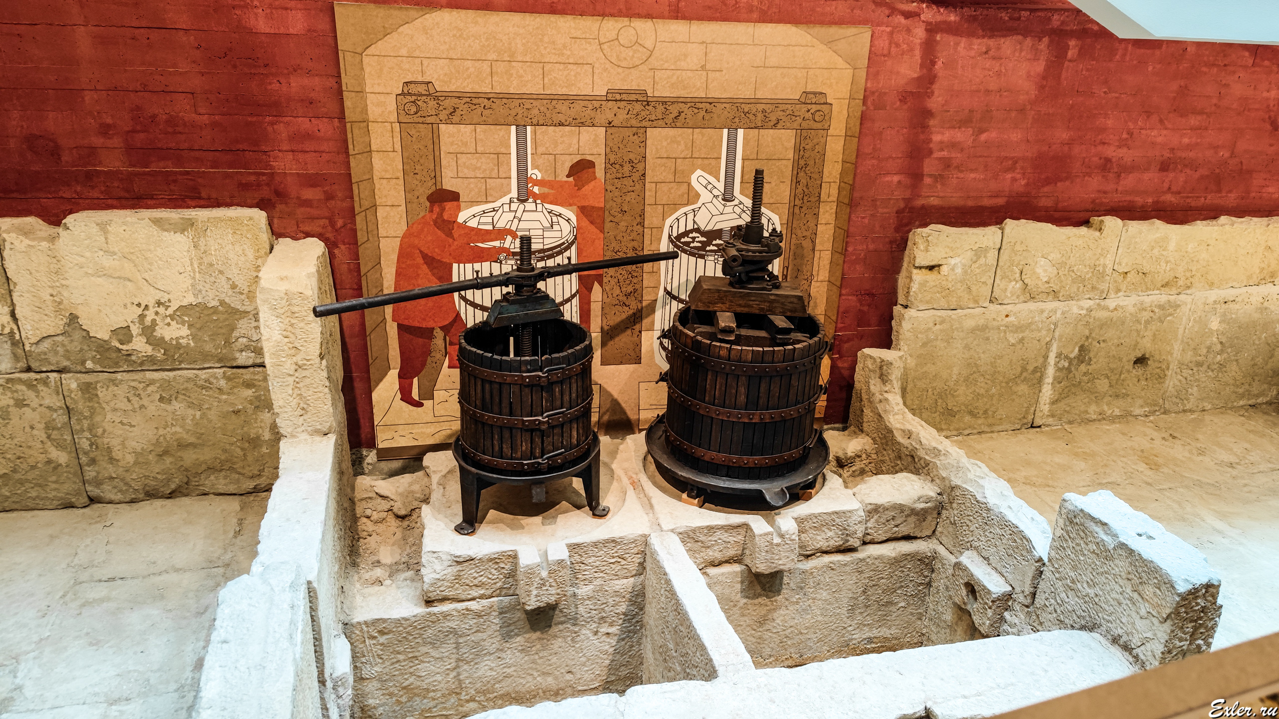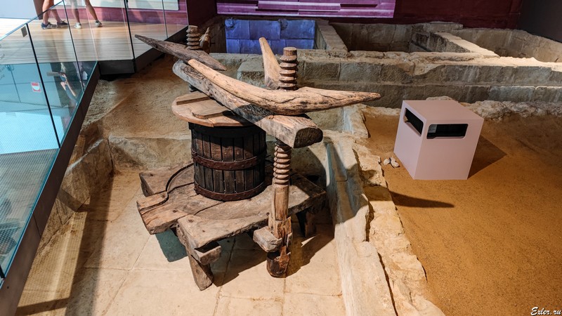 Старинные прессы, емкости для виноградного сока.