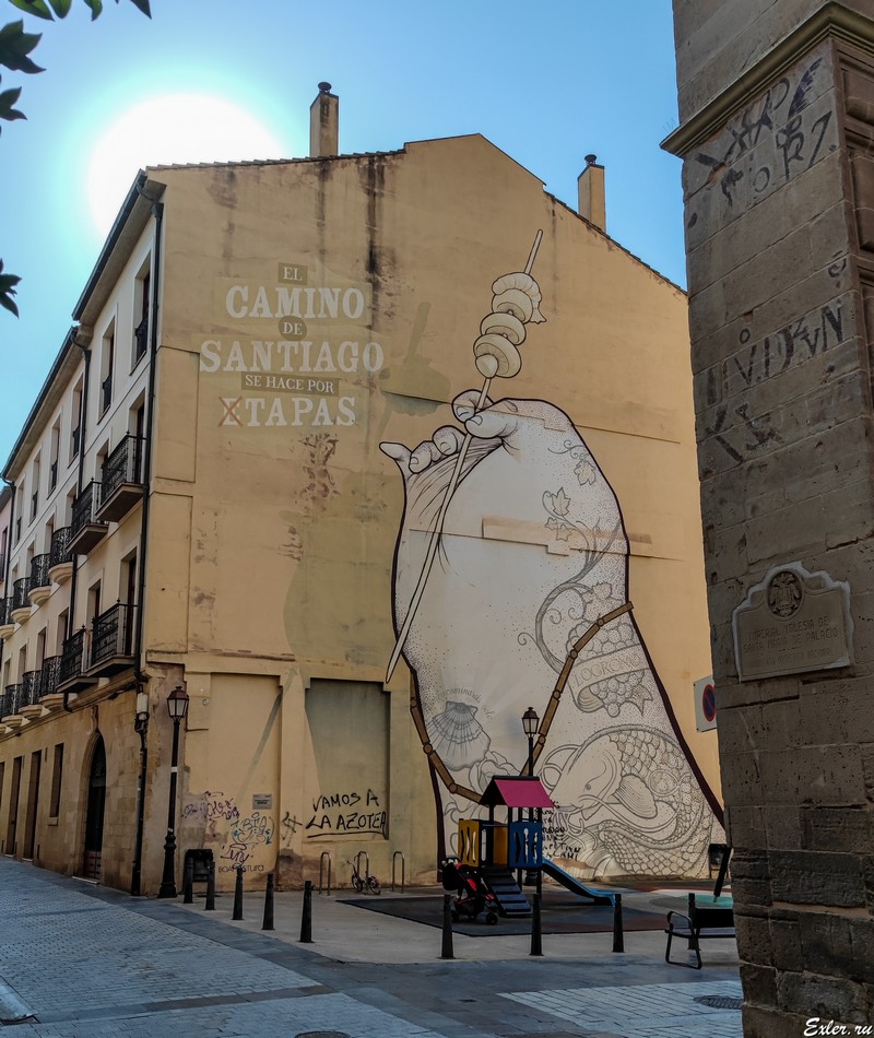 Надпись на стене на фото ниже: "Путь Иакова делается по этапам", при этом начало у "этапов" зачеркнуто, то есть получается, что "Путь Иакова делается по тапасам". И вот уж с чем тут в Логроньо хорошо - так это с тапас и пинчос (более продвинутыми вариантами тапасов).