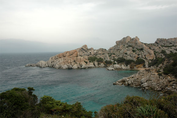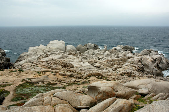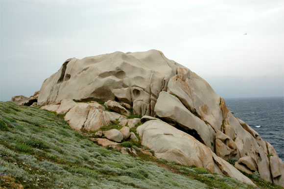 После неудачной дегустации нас повезли на панораму Capo Testa - это живописное местечко на самом севере Сардинии, откуда просматривается остров Корсика. Так как Корсика, то есть Франция, там совсем рядом, в районе Capo Testa итальянские мобильные операторы вдруг сменяются французскими. На вопрос гиду, какими именно операторами пользуются местные итальянцы, он ответил, что пользуются французскими и не парятся - мол, они тут лучше работают. Мы пытались выяснить, каким образом они это все оплачивают и насколько это все выгодно, но внятного ответа на данный вопрос не получили. (Гид у нас был очень своеобразный: русский, который последние восемнадцать лет живет на Сардинии. Русский язык он то ли забыл, то ли не знал, а итальянским овладел серединка-наполовинку. Поэтому те интереснейшие сведения, которыми он нас ухитрился снабдить за четыре дня, можно уложить в один спичечный коробочек, причем там еще останется масса места. А уж его манера в момент перевода с итальянского постоянно выдумывать от себя всякую чушь - так просто поражала нас в самое сердце.)