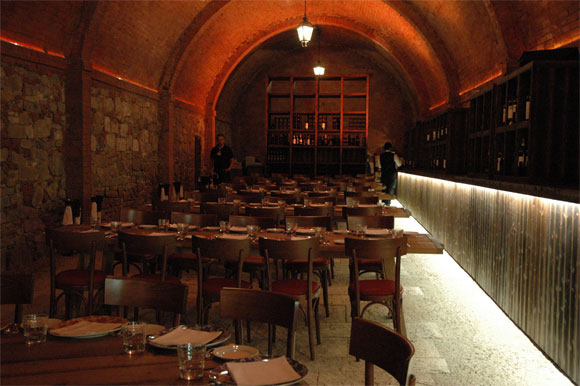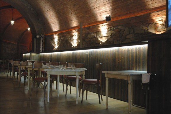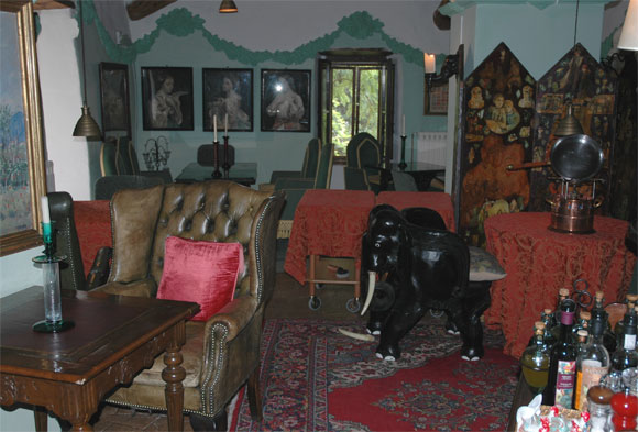 Ресторан отеля выполнен в старинном стиле: полуподвальное помещение без окон, полумрак, деревянные столы.