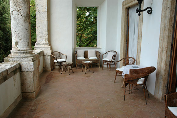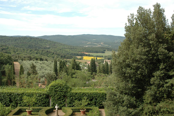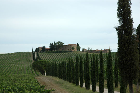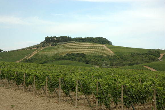 Замок стоит на холме, окруженном... Правильно, виноградниками и оливковыми рощами. Причем дорога, ведущая к отелю, обсажена пирамидальными тополями, так что вид там - просто роскошный.