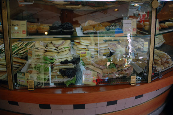 Но больше всего меня поразил ресторанчик самообслуживания - читай, столовка. Берете поднос, ходите вдоль стоек, на которых огромный выбор самой разнообразной еды: салаты, холодные закуски, горячие закуски, горячие блюда, куча всякой пасты. Набираете все что хотите, идете к кассе и оплачиваете. После этого занимаете понравившийся столик и уничтожаете все то, что приобрели.