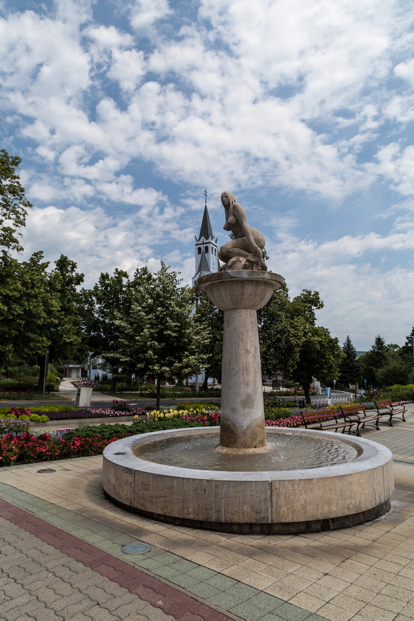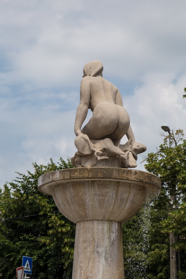Напротив церкви установлена главная достопримечательность города - скульптура "Нимфа, туды ее в качель". Как пишут в путеводителе, скульптура обнаженной девушки олицетворяет красоту и здоровье. Из девушки непрерывно льется вода, которая также что-то олицетворяет. То ли красоту, то ли здоровье, то ли водные процедуры.