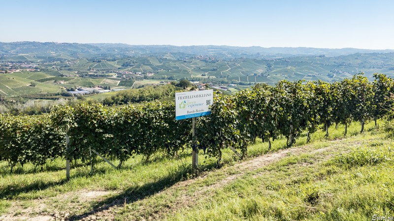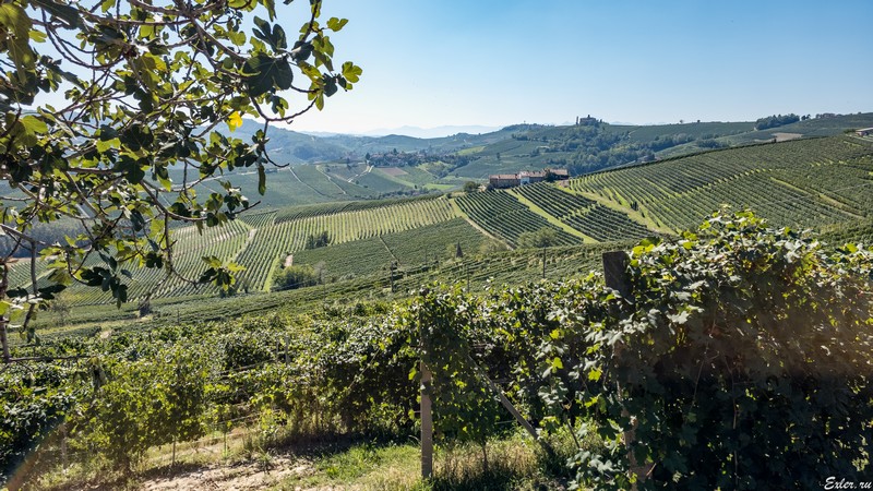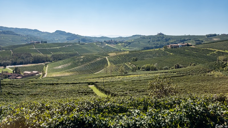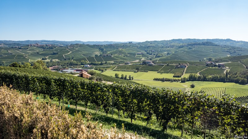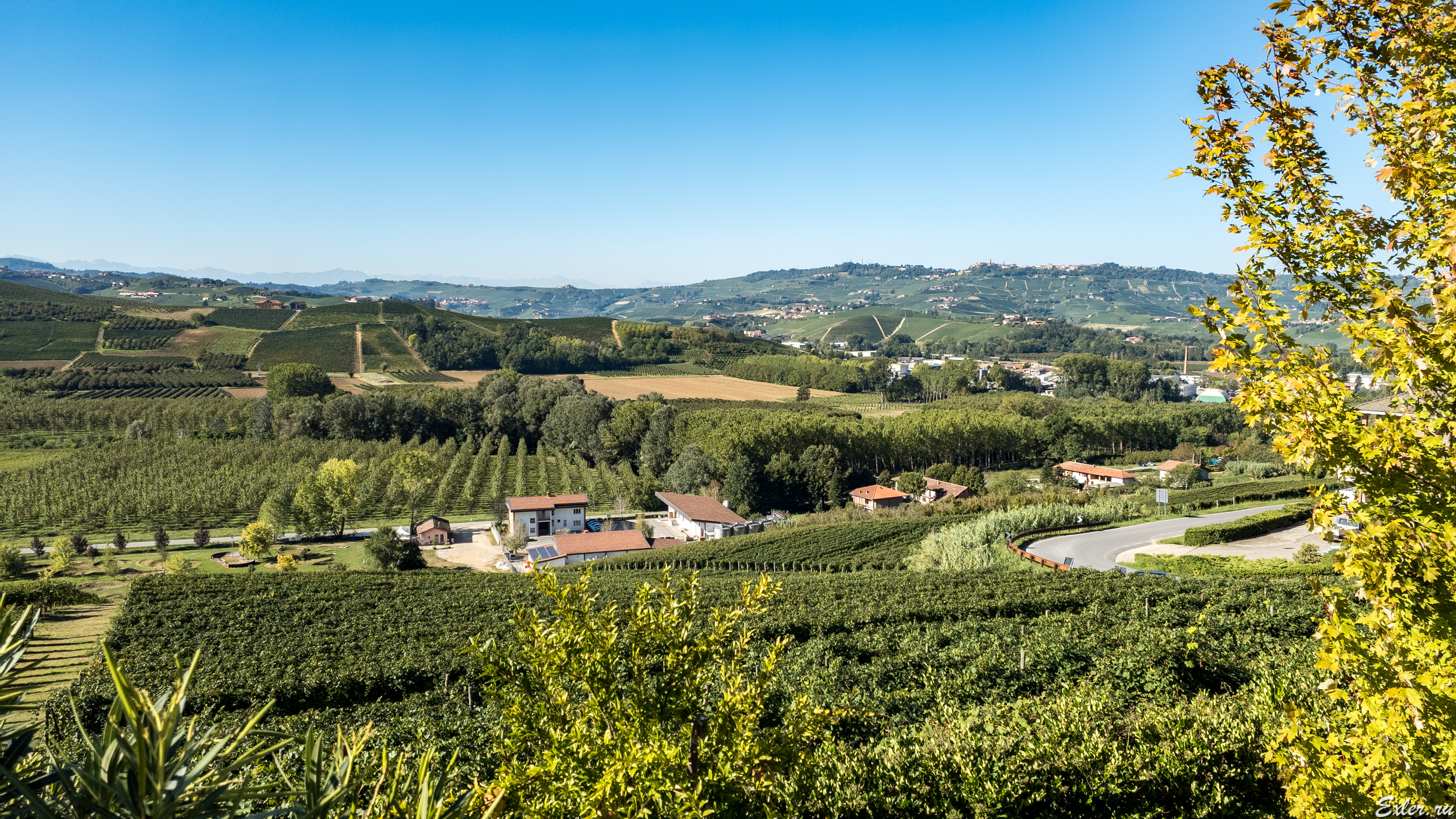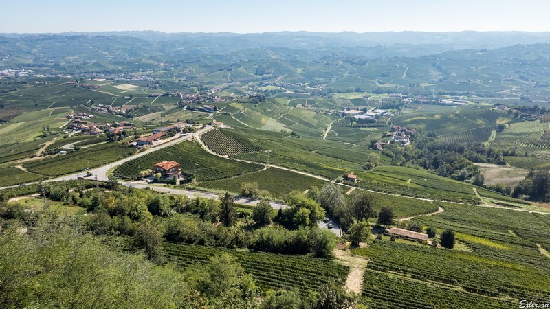Ну а теперь разворачиваемся и смотрим с площадки на открывающиеся виды виноградников Ланге. Впечатляет, да? Местные сюда нередко приезжают к закату, чтобы просто полюбоваться на виды. Ну и, конечно, ближе к закату все это выглядит намного живописнее, потому что когда мы там были, мне пришлось снимать в контровом свете, также еще была какая-то дымка.